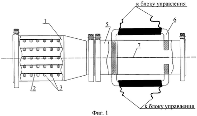 Наиболее близким к заявляемому объекту является способ обработки продукции скважин, включающий нагрев с последующей ее обработкой в магнитном поле для коалесценции эмульгированных капель воды и разрушением бронирующих оболочек на границе раздела фаз “нефть-вода” для дополнительного слияния капель воды. Для создания магнитного поля служит установка магнитной обработки, в которой магниты установлены в форме кольца. Узел разрушения бронирующих оболочек выполнен с сужающейся и расширяющейся частями в виде конуса и с турбулизатором потока в виде цилиндра. [Патент РФ №2149260, кл. Е 21 В 43/34, 2000 г.].