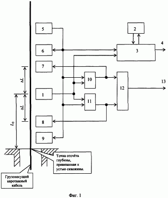 Сигнал, соответствующий расстоянию L0 между УС 1 и точкой отсчета глубины спуска скважинного прибора, хранится в блоке памяти 2.
