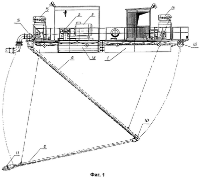 Шарнир 5 может быть размещен или в носовой или в кормовой части корпуса. На чертеже представлен вариант с кормовым расположением шарнира 5. В транспортном положении грунтозаборное устройство находится в горизонтальном положении независимо от места расположения шарнира 5.