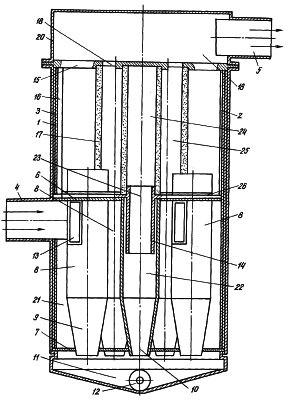 Предлагаемое изобретение поясняется чертежом, где изображен осевой продольный разрез предлагаемого мультициклонного нейтрализатора газов.
