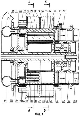 Роторный двигатель (фиг.1) содержит корпус 1 и вращающийся в нем ротор 2. Наружная окружная поверхность внешней стенки 3 ротора 2 герметично прилегает к внутренней окружной поверхности корпуса 1. Герметичность прилегания указанных поверхностей обеспечивается минимальными зазорами и бесконтактными уплотнениями 4, установленными в корпусе 1. На корпусе 1 равномерно по окружности установлены шестнадцать цилиндрических рабочих камер, последовательно пронумерованных с 5 по 20 (фиг.2, 3). Каждая рабочая камера имеет по одному окну 21, выполненному по всей длине рабочей камеры и совмещенному с соответствующим окном в корпусе 1. Внутри каждой рабочей камеры (фиг.1) установлена перегородка 22, разделяющая рабочую камеру на основную 23 и дополнительную 24 части. Основная часть 23 рабочей камеры предназначена для осуществления термодинамического цикла двигателя внутреннего сгорания, а дополнительная часть 24 рабочей камеры предназначена для заполнения дополнительным воздухом, не участвующем в процессе сгорания топлива. Внутри ротора 2 (фиг.2, 3, 4) размещен воздушный канал 25 для подвода воздуха к рабочим камерам. Входное окно 26 (фиг.4) воздушного канала 25 расположено на радиальной поверхности ротора 2, а выходное окно 27 воздушного канала 25 расположено на наружной окружной поверхности ротора 2. Внутри ротора 2 размещен выпускной канал 28 (фиг.2, 3, 4) для отвода рабочего тела из рабочих камер в процессе их продувки и заполнения воздухом. Входное окно 29 (фиг.4) выпускного канала 28 расположено на наружной окружной поверхности ротора 2, а выходное окно 30 выпускного канала 28 расположено на радиальной поверхности ротора 2. Выходное окно 27 воздушного канала 25 и входное окно 29 выпускного канала 28, расположенные на наружной окружной поверхности ротора 2, имеют участки одновременного совмещения с окнами 21 рабочих камер для осуществления продувки и заполнения рабочих камер воздухом. Выходное окно 27 и входное окно 29 (фиг.4) одновременно совмещены с окнами 21 рабочих камер 5, 6, 7. Внутри ротора 2 установлен рабочий канал 31 (фиг.2, 3) для выпуска горячего газа и дополнительного воздуха из рабочих камер и преобразования их избыточной энергии в крутящий момент на роторе 2. Входное окно 32 рабочего канала 31 расположено на наружной окружной поверхности ротора 2, а выходное окно 33 рабочего канала 31 расположено на радиальной поверхности ротора 2 (фиг.3). Для увеличения крутящего момента на роторе 2 в рабочем канале 31 установлены рабочие лопатки 34, 35, 36. В роторе 2 установлены перепускные каналы 37, 38, 39, 40 (фиг.2), каждый из которых имеет одно впускное и одно выпускное окна на наружной окружной поверхности ротора 2 и предназначен для соединения между собой при вращении ротора 2 основных частей 23 рабочих камер, в которых процесс сгорания топлива завершился, и основных частей 23 рабочих камер, заполненных воздухом, для осуществления процесса сжатия воздуха перепускаемым горячим газом. Входное окно 41 (фиг.2) перепускного канала 37 совмещено с окном рабочей камеры 13, а выходное окно 42 – с окном рабочей камеры 11; входное окно 43 перепускного канала 38 совмещено с окном рабочей камеры 14, а выходное окно 44 – с окном рабочей камеры 10; входное окно 45 перепускного канала 39 совмещено с окном рабочей камеры 15, а выходное окно 46 – с окном рабочей камеры 9; входное окно 47 перепускного канала 40 совмещено с окном