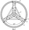 Для получения единичных мощностей в 150, 600, 1000 и 10.000 кВт потребуется осуществить определенные конструктивные решения. В частности, надо разгрузить нижний подшипниковый блок, а три конца консольной части должны опираться на шасси на резиновом ходу или на колесные пары, как в железнодорожных вагонах, и двигаться это соответственно должно по асфальтобетонному покрытию или по круговому рельсовому пути (фиг.1, 2).
