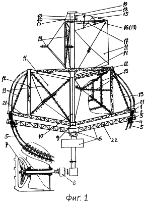 Как видно на фиг.1, каркас каждой из шести пирамидальных лопастей 11 состоит из пространственных ферм 12, 21, 22 и трубчато-уголковых элементов 13. Это позволяет сделать конструкцию лопастей 11 надежной, неметаллоемкой и простой.
