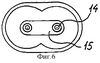 В качестве альтернативы, как показано на фиг.5, первый шнек 1 и второй шнек 2 имеют одинаковые спиральные витки 2, 7. Это обеспечивает подачу одинакового количества материала от каждого из двух шнеков 1, 6. В этом случае режущее приспособление содержит сдвоенный перфорированный диск 12, имеющий форму “восьмерки”, и соответствующие (каждой половине диска) ножи 11, приводимые во вращение с помощью валов 9, на которых смонтированы шнеки 1, 6, которые вращаются, следовательно, в противоположных направлениях, находясь в контактном взаимодействии.