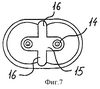 На фиг.6 показана конструкция опорного узла концов нагнетательных шнеков 1, 6, расположенных ниже по ходу перемещения материала. Конструкция этого узла включает опорные подшипники шнеков 1, 6 или соответствующих валов 9 и первый соединительный элемент 15 в виде перемычки, проходящей между указанными подшипниковыми опорами 14, обеспечивающей фиксацию положения концов двух шнеков 1, 6 относительно друг друга. Наличие соединительной перемычки препятствует смещению двух шнеков в направлении друг от друга (т.е. их разобщению) в результате происходящего в нагнетательной камере 5 вытеснения материала из шнеков 1, 6 в процессе их взаимодействия. Такая конструкция опорного узла в значительной степени уменьшает износ окружающих шнеки поверхностей камеры нагнетания 5, поскольку при отсутствии соединительного элемента отжатию двух шнеков 1, 6 друг от друга должны противодействовать сами поверхности камеры.
