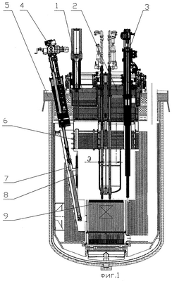 После загрузки гнезда 8 элеватора 4 производится подъем элеватором 4 элемента активной зоны 9 в положение перегрузки таким образом, чтобы головка элемента активной зоны 9 выступала над уровнем теплоносителя, а ось симметрии гнезда 8 элеватора 4 совпала с радиусом, на котором находится ось симметрии перегрузочного канала 6. Вращение поворотных пробок 1 и 2 перегрузочной канал 6 наводится на гнездо 8 элеватора 4, после чего производится извлечение отработавшего элемента активной зоны 9 из гнезда 8 элеватора 4 через перегрузочный канал 6 внереакторной перегрузочной машиной (на чертеже не показана).