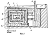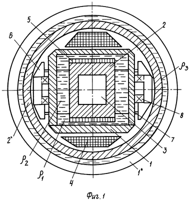 Зазор между цилиндрической инерционной массой ротором-поплавком 2 и цилиндрической камерой 1 заполняют несмешивающимися жидкостями плотности 1 и 2, причем в торцевых зазорах размещают одинаковые объемы жидкости плотности 2, большей плотности 1 (подробно способ заполнения зазоров гидродинамического подвеса жидкостью с различными плотностями рассмотрен ниже, т.к. он не очевиден).