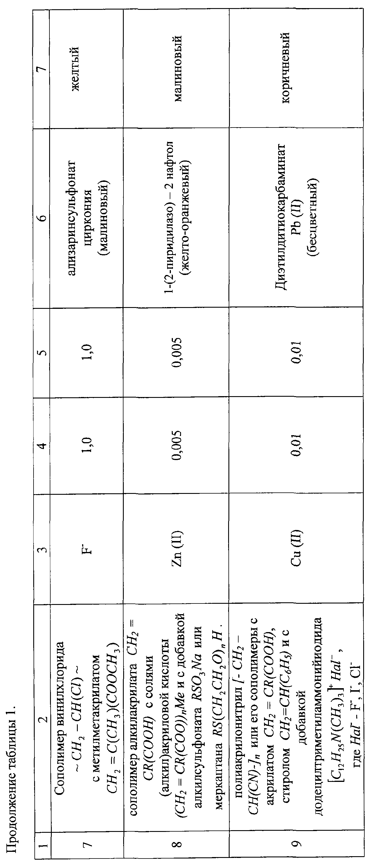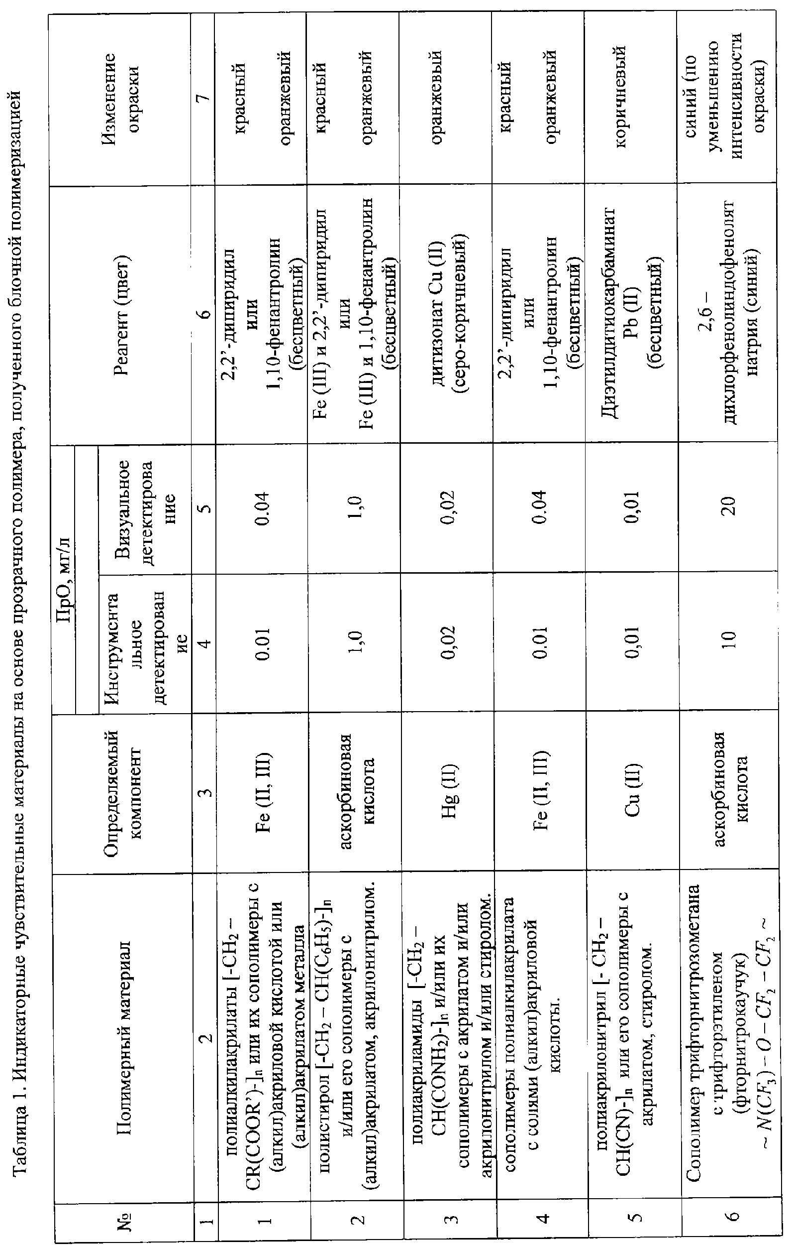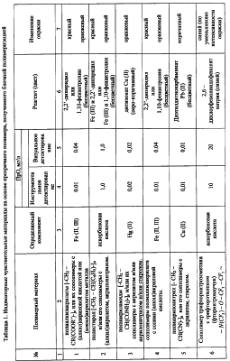 Изобретение относится к аналитической химии и может быть использовано для оперативного контроля концентрации примесей в жидкостях и газах как в лабораторных, так и в полевых условиях. В аналитической химии для определения ионов металлов широко используют спектрофотометрические методы в ультрафиолетовой и видимой областях. Существует множество комплексообразующих реагентов, которые дают окрашенные комплексы с ионами металлов. Известны оптические химические сенсоры для определения ионов металлов (Каттралл Роберт В. Химические сенсоры. – М.: Научный мир, 2000 – с.87), которые представляют из себя прозрачный твердый поливинилхлоридный носитель (матрицу), в который иммобилизуют аналитический реагент. Такие сенсоры могут быть применены только в лабораторных условиях с использованием спектрофотометра. Кроме того, при иммобилизации реагента в матрицу его необходимо перевести в липофильную форму. Это приводит к увеличению расхода реагента и усложнению изготовления индикаторного чувствительного материала. Для экспресс-тестирования компонентов используют индикаторный чувствительный материал на основе пенополиуретана в виде непрозрачной таблетки белого цвета с иммобилизованным в его объем реагентом. Детектирование окрашенных соединений можно проводить визуально либо с применением специальных приборов, регистрирующих изменение спектральных характеристик чувствительного элемента после сорбции и образования окрашенного соединения (Соросовский образовательный журнал №8, 1998, стр.68). Полная непрозрачность матрицы обуславливает применение отражательной спектроскопии, что приводит, как и в предыдущем случае, к снижению точности измерений. При визуальном контроле о наличии компонента судят по тону появившейся окраски, а о количестве – по ее интенсивности после сравнения с эталонной шкалой, что позволяет получить только полуколичественный результат, ошибка которого может составлять до тридцати процентов. Индикаторный чувствительный материал (ИЧМ) для экспресс-тестирования следов веществ (патент РФ №2067297, МПК 6 G 01 N 31/22, G 01 N 27/416), выбранный в качестве прототипа, включает твердый носитель, реагент и отбеливатель в виде выпускаемого промышленностью белофора для повышения контрастности, что приводит к увеличению чувствительности визуального тестирования. В качестве твердого носителя используют полимерные волокнистые материалы с элементарными звеньями целлюлозы или полиамида, а в качестве реагента используют реагент с высокой селективностью по отношению к определяемому иону. Недостатком этого ИЧМ является необходимость применения реагентов, у которых Задачей предлагаемого изобретения является создание прозрачного индикаторного чувствительного материала, позволяющего упростить визуальную и фотометрическую оценку изменения его окраски после контакта с анализируемым объектом. Поставленная задача решается тем, что предложенный ИЧМ для определения компонентов в анализируемых объектах, включающий, как и прототип, твердый полимерный носитель с реагентом, согласно изобретению твердый полимерный носитель выполнен из прозрачного полимерного материала, содержащего функциональные группы, обеспечивающие межмолекулярные взаимодействия с реагентом и/или определяемым веществом и выбранные из ряда: амидная -CONH2,