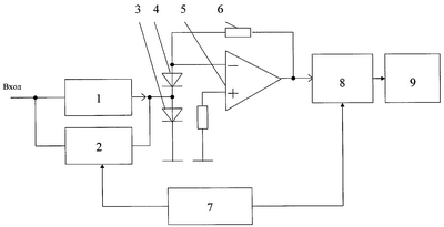 При этом вход коаксиальной линии 1 соединен со входом коммутирующего устройства 2, их выходы соединены между собой и с точкой соединения катода первого диода 4 с анодом второго диода 3, инвертирующий вход операционного усилителя 5 соединен с анодом первого диода 4 и через цепь обратной связи 6 со своим выходом, неинвертирующий вход операционного усилителя 5 через резистор подключен к земляной шине, к которой также подсоединен катод второго диода 3, выход операционного усилителя 5 соединен с входом анализирующего устройства 8, выход которого соединен со входом индикатора 9, а выходы устройства управления 7 соединены с управляющими входами коммутирующего 2 и анализирующего 8 устройств, причем точка соединения входа коаксиальной линии 1 с коммутирующим устройством 2 является входом всего устройства.