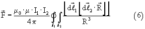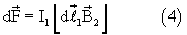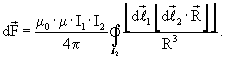 Определим силу ампера , с которой круговой виток с током I2 действует на виток с током I1. Сначала найдем силу, с которой магнитное поле с индукцией , создаваемое током I2, действует на элемент , принадлежащий контуру l1 с током I1 (фиг 2):