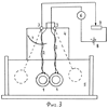 Схема экспериментальной установки для исследования жидкого магнетика представлена на фиг.3. Она содержит две плоские катушки индуктивности 1. Обе катушки 1 подвешены на жестких подвесах 2. Первые концы жестких подвесов 2 неподвижно соединены с катушками индуктивности 1, а вторые концы их подвешены шарнирно на осях вращения 3 катушек индуктивности, которые закреплены на подставке 4. Плоские катушки индуктивности 1 соединены последовательно между собой, расположены в сосуде с жидким магнетиком 5 в одной плоскости, перпендикулярной осям самих катушек индуктивности 1 и осям вращения 3 этих катушек. Первым вводом каждой катушки индуктивности 1 является жесткий подвес 2, а вторым вводом – тонкий изолированный проводник, навитый на жесткий подвес 2. Последовательно соединенные плоские катушки индуктивности 1 соединены также последовательно с амперметром 6, реостатом 7 и источником постоянного тока 8.