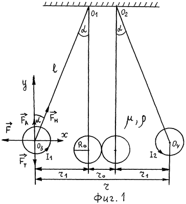 Пусть два круговых витка с током I1 и I2 и радиусом R0 (фиг.1) подвешены на двух жестких одинаковых подвесах длиной 1 на осях O1 и O2. Катушки находятся в исходном положении на расстоянии r0 в жидком магнетике с магнитной проницательностью и плотностью . Круговые витки расположены в одной плоскости, перпендикулярной осям вращения катушек O1 и O2, а также осям самих катушек О3 и O4. Под действием силы Ампера эти витки разойдутся на угол от исходного положения. В жидком магнетике на круговой виток с током I1 (фиг.1) действуют четыре силы: сила Ампера , сила натяжения нити , сила тяжести и выталкивающая сила Архимеда , где VB – объем кругового витка, – плоскость жидкого магнетика, mB – масса витка и g – ускорение свободного падения.