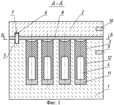 Корпус 1 предложенного контейнера и его крышка 2 изготовлены в виде монолитных блоков из мелкозернистой горной породы с высоким содержанием кремнезема (от 65 до 80%), например из черного долерита, гранита или базальта. Данная горная порода является стойкой к таким разрушающим факторам, как высокая влажность, циклические изменения температуры, воздействие повышенной кислотности окружающей среды и т.п. Корпус 1 имеет форму параллелепипеда или другую, удобную для перевозки и складирования форму. Верхняя поверхность корпуса 1 и прилегающая к ней нижняя поверхность крышки 2 выполнены плоскими и имеют невысокую степень шероховатости. В корпусе 1 со стороны его верхней поверхности выполнены посредством сверления загрузочные гнезда 3, расположенные вертикально и имеющие цилиндрическую форму. Между загрузочными гнездами 3 сохраняется стенка необходимой толщины для исключения взаимного влияния источников излучения. Толщина боковых стенок корпуса 1 и его нижней стенки составляет не менее 0,08 м. Толщина крышки 2 составляет не менее 0,05 м. Продольные и поперечные размеры загрузочных гнезд 3 превышают соответствующие размеры закладываемых в них пеналов 4. В корпусе 1 и в крышке 2 высверлены по два ответных гнезда 5 и 6 соответственно для закладки в них крепежных штифтов 7. Ответные гнезда 5 и 6 расположены в противоположных углах корпуса 1 и крышки 2. Между корпусом 1 и крышкой 2 помещена плоская свинцовая прокладка 8, расположенная по периферийной части зоны сопряжения корпуса 1 и крышки 2 или по всей поверхности этой зоны. В прокладке 8 имеются отверстия для прохода крепежных штифтов 7 (не показаны), совпадающие с расположением ответных гнезд 5 и 6. В корпусе 1 высверлены четыре такелажных гнезда 9, а в крышке 2 – четыре такелажных гнезда 10. Такелажные гнезда 9 расположены параллельно верхней поверхности корпуса 1, а такелажные гнезда 10 – параллельно нижней поверхности крышки 2.