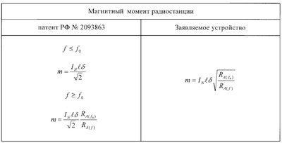 Основываясь на известных формулах, проведем сравнительный анализ величин магнитного момента радиостанции, принятой за ближайший аналог (патент РФ №2093863), и заявляемого устройства.