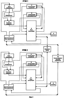 Обмен информацией о состоянии переключателей осуществляется по линии передачи сигналов управления 10, которая выполнена оптоволоконной. Сигналы о состоянии переключателей БК 9 РПМ 1 и БК 9 РПМ 2 с шестых выходов этих блоков поступают на первые входы ДБУ 7 соответствующих РПМ. Если состояние вышеупомянутых переключателей соответствует заданному, то с первого выхода ДБУ 7 на вход БУ 1 РПМ 1 поступает “команда – разрешение” на ввод в работу усилителя мощности 3.