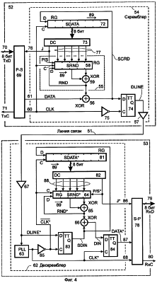 Генератор 55 псевдослучайной последовательности битов скремблера 54 содержит сдвиговый регистр 58 и элемент Исключающее ИЛИ 59. Аналогичный генератор псевдослучайной последовательности битов дескремблера 62 содержит сдвиговый регистр 64 и элемент Исключающее ИЛИ 65.