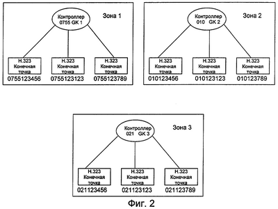 На фиг.2 показаны три зоны контроллеров, и каждая зона имеет уникальный номер как префикс для образования имени конечной точки. Каждый префикс зоны контроллера не повторяется во всей системе IP-сети. Например, префикс зоны контроллера 1 – 0755, префикс зоны контроллера 2 – 010, а префикс зоны контроллера 3 – 021.