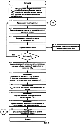 Предварительно устанавливают параметры обработки пакетов, общие для всех потоков: объем памяти Ввы k, выделенной для k-го порта центра коммутации, дискретное значение объема памяти В и функцию коэффициента задержки подтверждения Р(ВT). Величина объема дискретного значения памяти определяется выражением где М – значение частоты дискретизации М памяти определяется в соответствии с теоремой Котельникова В.А. по формуле M 2·N, где N 1 число потоков пакетов данных, обрабатываемых ЦК в k-ом направлении передачи. Выбор значения М определяет чувствительность системы управления потоками пакетов данных к изменению их интенсивности. Изменение значения функции коэффициента задержки подтверждения Р(ВT) позволит регулировать время задержки подтверждения приема очередного пакета. Затем принимают пакеты N потоков. При приеме пакетов их идентифицируют по принадлежности к одному из потоков и передают в память k-го порта центра коммутации объемом Ввыд для последующей обработки.