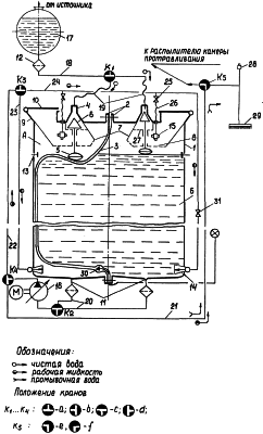 Взаимное расположение трехходовых кранов: К1 – в водоподводящей, К2 – во всасываюшей, К4 – в нагнетательной и К3 – в обратной магистралях обеспечивает непрерывность процесса протравливания.