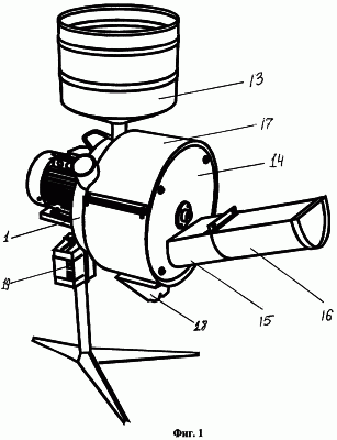 – стальным защитным кожухом-отражателем 17, установленным с зазором до 30 мм относительно корпуса 4, со съемным кожаным чехлом 18 в нижней части кожуха-отражателя 17 для сбора готового корма. При этом между корпусом 4 и кожухом-отражателем 17 установлены изолирующие прокладки (не показаны).
