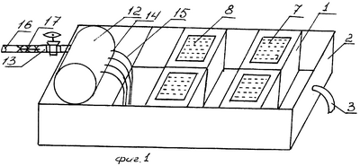 Отработанная вода из инкубационной емкости 4 через сетчатое окно 8 крышки 7 выливается в кювету 2 и через штуцер 3 водосброса выводится в канализацию. При засорении сетки окна 8 крышка 7 приподнимается и сетка чистится от загрязнения.