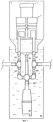 Перед работой устройства необходимо удалить воздух из трубопроводов, кранов и емкостей. Для этого в герметичную емкость 2 с помещенной в нее вакуумной камерой 3 заливается обезгаженная (кипяченая) вода, вставляется и закрывается крышка, доливается вода. Закрываются краны K1, K2, перекрывающие трубопровод. Герметичная емкость 2 с вакуумной камерой 3 переворачивается и помещается в поддон П с водой (фиг.1). Для этого трубопроводы 4, 6 и отвод 5 могут быть выполнены из толстостенных металлических труб, а соединения с внешними коммуникациями при помощи гибких трубопроводов. Электрический привод электродвигателя 1 и насоса Н выполнены с необходимой гидроизоляцией. При работе устройства герметичная емкость 2 может опираться на корпус поддона П.
