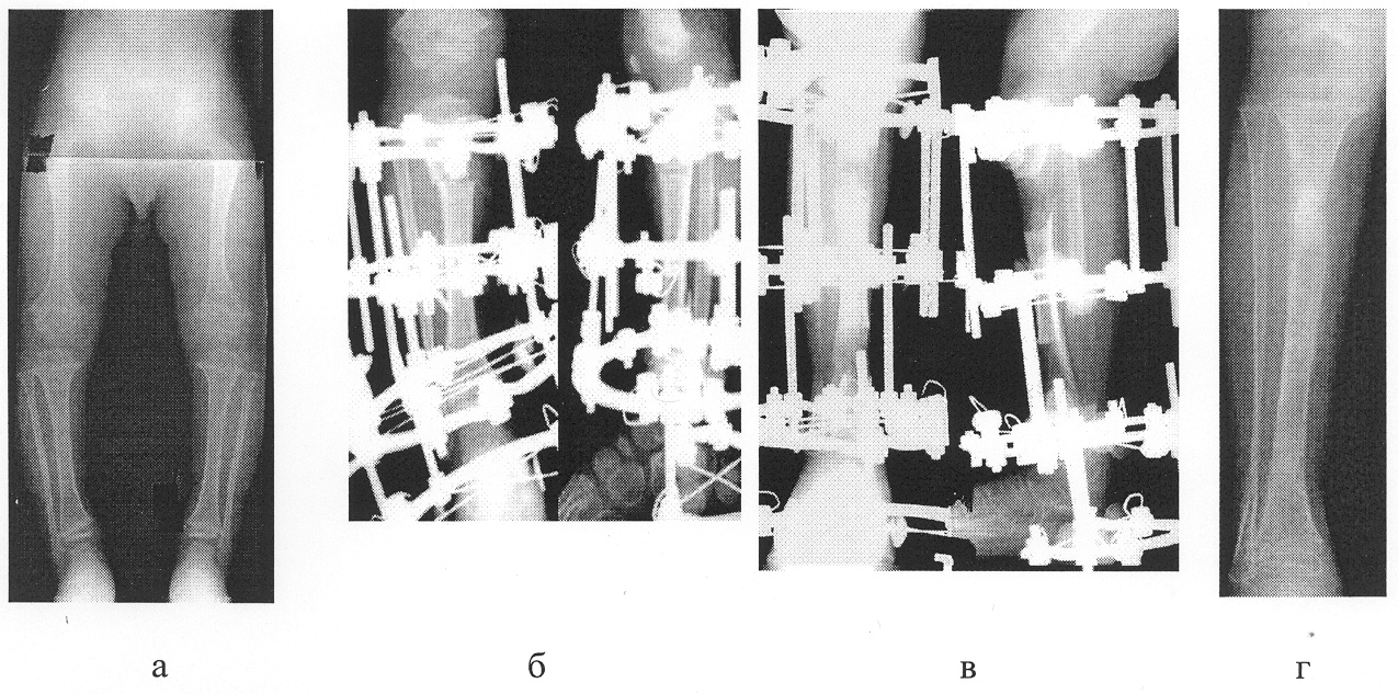 В результате лечения достигнуто увеличение длины голеней на 8 см, восстановлена их биомеханическая ось. Движения в голеностопном и в коленном суставах на момент демонтажа аппарата в пределах нормы, жалоб на особые болевые ощущения больной не предъявлял, осложнений неврологического характера в течение всего срока лечения и после его окончания не отмечалось. Общий срок лечения составил 98 дней (Фиг.1а-г).