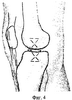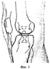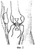 Далее приступают к балансировке боковых стабилизирующих структур сустава, осуществляют подкожное прошивание при варусной деформации коллатеральной малоберцовой связки, части наружного надколенникового растяжения и фиброзной капсулы сустава лавсановыми швами выше и ниже суставной щели, отступя от нее на 2-3 см (фиг.1). Вкол и выкол при этом осуществляется через одно и то же отверстие в коже. При этом места вкола и выкола проксимальной и дистальной нитей должны совпасть на уровне суставной щели (фиг.2). Прошивание боковых стабилизаторов сустава лавсаном проводится через все описанные выше структуры (смотри 2 стр., 3 – 4 строчки снизу), единым блоком.