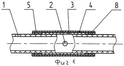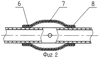 Пример 2. На части образцов серии А на поверхности концов раздувного участка 7 были концентрически установлены монолитно соединенные с этой поверхностью трубчатые отрезки 9 из силиконовой резины, аналогичной по своей растяжимости резине внутреннего 3 и внешнего 4 слоев стенки баллона. Толщина стенок трубчатых отрезков 9 – 0,3 мм, длина 6-8 мм. Монолитность соединения отрезков с поверхностью раздувного участка 7 обеспечивалась силиконовым адгезионным подслоем 8. При заполнении баллонов образцов серии А и новых образцов (серия С) рабочей средой в количестве 1,5 мл установлено, что трубчатые отрезки 9 расширяются совместно с баллоном. Значения отношений длины баллона в продольном направлении к длине баллона в поперечном направлении: