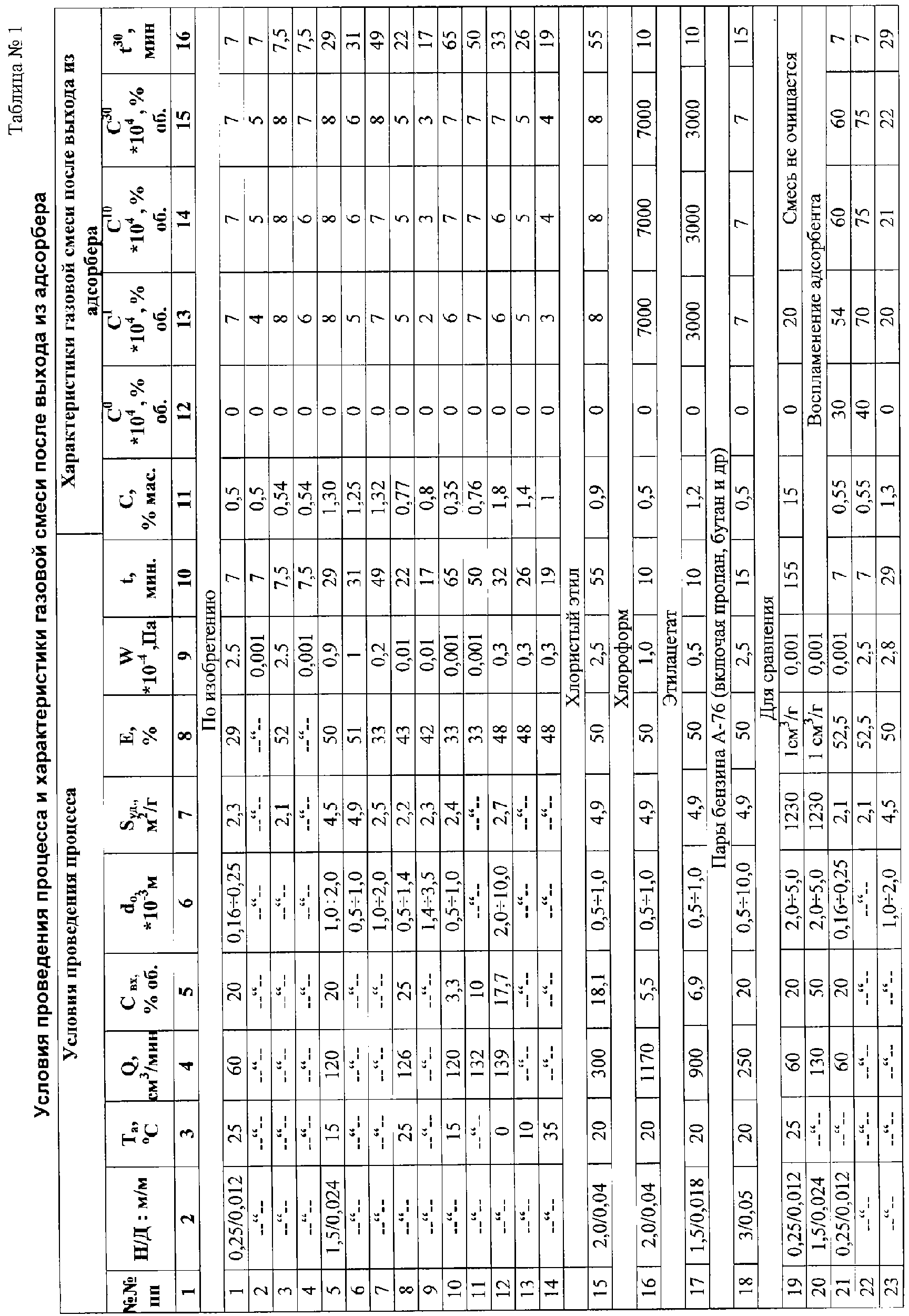 Изобретение относится к области химической технологии, а именно к способам извлечения летучих химических соединений из газовоздушных смесей. Способ включает пропускание газовоздушной смеси через слой порошкообразного полимерного адсорбента и последующую десорбцию. В качестве адсорбента используют порошок поливинилхлорида с размером частиц 0,16-10,00 мм и суммарной пористостью частиц от 29% до 52%. Десорбцию проводят под вакуумом при остаточном давлении от 0,001*104 Па до 2,5*104 Па. Процесс адсорбции осуществляют в периодическом режиме в адсорберах со стационарным слоем адсорбента. Изобретение позволяет проводить количественное извлечение широкого спектра органических веществ из газовоздушных смесей при упрощении технологического процесса очистки. 1 табл.