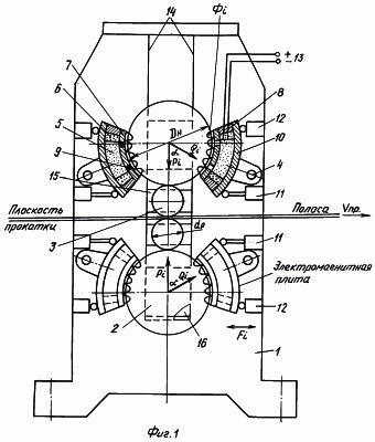 Клеть содержит станину 1, нажимные 2 и рабочие 3 валки, электропостоянные плиты, соединенные с помощью шарниров 4 со станиной клети. Каждая электропостоянная плита состоит из секций, содержащих постоянный магнит 5 (например, литой или оксидно-бариевый), катушку управления 6, полюсник 7, корпус 8, вставку 9 из немагнитного материала. Все секции крепятся на общее основание – магнитопровод 10.