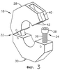 Обжимной штамп 16 и муфта 18 могут быть выполнены из любого материала, пригодного для обжатия обрабатываемых деталей. Обжимной штамп 16 и муфта 18 могут быть изготовлены из одинакового материала, такого как сталь. В альтернативном варианте любой из элементов или оба элемента могут быть изготовлены из других пригодных материалов, включая алюминий, нержавеющую сталь, титан или никелевые сплавы, но возможные материалы не ограничены указанными выше. Муфта 18, показанная на фиг.3, имеет первую зажимную часть 28 и вторую зажимную часть 30. Первая зажимная часть 28 и вторая зажимная часть 30 соединены вместе с помощью шарнирного соединения 32. Вторая зажимная часть 30 имеет на поверхности муфты зажим муфты или фиксатор, такой как зажимной болт 34. Зажимной болт 34 имеет стержень 36 болта и головку 38 болта. Стержень 36 болта предназначен для вставки внутрь выполненного в первой зажимной части 28 паза 40 муфты. Паз 40 муфты имеет удерживающие выступы 42, на которые опирается головка 38 болта, когда обрабатываемая деталь расположена между частями 28 и 30. Головка 38 болта может быть выполнена с пазом или иметь аналогичные средства для затягивания, так что при затягивании болта относительно выступов 42 обрабатываемая деталь остается зафиксированной на месте. Шарнирное соединение 32 создает простое средство для удерживания частей 28 и 30 вместе и при этом обеспечивает возможность простой вставки и извлечения обрабатываемой детали. В альтернативном варианте муфта может быть выполнена из двух отдельных частей, которые соединяются друг с другом без возможности поворота друг относительно друга. Вместо этого две отдельные части могут быть соединены вместе с помощью альтернативного средства скрепления муфты, такого как комплект болтов и соответствующих гаек, наряду с другими широко используемыми возможными средствами присоединения.