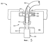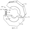 Обжимной штамп 54 и муфта 56 могут быть выполнены из любого материала, пригодного для обжатия обрабатываемых деталей. Обжимной штамп 54 и муфта 56 могут быть изготовлены из одинакового материала, такого как сталь. В альтернативном варианте любой из элементов или оба элемента могут быть изготовлены из других пригодных материалов, включая алюминий, нержавеющую сталь, титан или никелевые сплавы, но возможные материалы не ограничены указанными выше. Муфта 56, показанная на фиг.6, имеет первую зажимную часть 70 и вторую зажимную часть 72. Первая зажимная часть 70 и вторая зажимная часть 72 соединены вместе с помощью шарнирного соединения 74. Вторая зажимная часть 72 имеет на поверхности муфты зажим муфты или фиксатор, такой как зажимной болт 76. Зажимной болт 76 имеет стержень 78 болта и головку 80 болта. Стержень 78 болта предназначен для вставки внутрь паза муфты по существу так же, как в конструкции и зажимном механизме муфты 18 на фиг.3. Шарнирное соединение 74 обеспечивает простое средство для удерживания частей 70 и 72 вместе и при этом делает простыми операции вставки и извлечения обрабатываемой детали. Чтобы обеспечить возможность размещения изогнутого участка трубы 52, вторая зажимная часть 72 имеет фаску или выемку 82 на своей вертикальной поверхности, ближайшей к изогнутому участку.