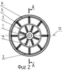 Каждое управляемое колесо, одно из которых показано на прилагаемых чертежах, поворачивают в горизонтальной плоскости, проходящей по геометрической оси 13 колеса. (В нашем случае эта горизонтальная плоскость совпадает с плоскостью листа чертежа.) Колесо поворачивают на необходимый угол , определяемый заданной кривизной траектории движения транспортного средства. В соответствии с целью изобретения повороту подвергают периферийную часть колеса, состоящую из обода 2 и пластикового бандажа 6, при неизменном (относительно рамы 8) положении его ступицы 1 и оси 7. При этом для поворота периферийной части колеса в упомянутой горизонтальной плоскости воздействуют на обод 2 колеса с помощью роликов 11 и 12, приводя один из них в контакт с ободом колеса всякий раз при выполнении маневра поворота. Упомянутые ролики при выполнении маневров поворота перемещают по дугообразной траектории 14, параллельной дугообразной направляющей 9 и находящейся в упомянутой горизонтальной плоскости. Для этого с помощью соответствующей системы управления, не показанной на чертежах, из кабины водителя транспортного средства осуществляют перемещение сегмента 10 по направляющей 9. Для уменьшения износа роликов 11 и 12 расстояние между ними выбрано с таким расчетом, чтобы обод 2 колеса находился между ними с зазором. Тогда при повороте направо (как на фиг.3) в контакте с ободом будет находиться ролик 12, а ролик 11 ввиду наличия упомянутого зазора не будет иметь контакта с ободом 2 и, следовательно, не будет вращаться и, соответственно, не будет подвергаться износу. При повороте налево в контакт с ободом 2 войдет ролик 11, а ролик 12 будет “отдыхать”. Можно подобрать зазор такой величины, чтобы при движении прямо оба ролика находились вне контакта с ободом колеса, тогда износ их будет минимальным.