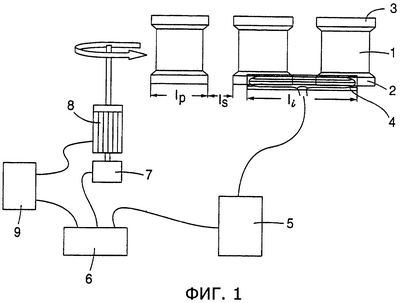 На фиг.1 показано, что ряд упаковок 1 проходит через индуктор 4. Каждая упаковка 1 имеет нижнюю кромку 2 и верхнюю кромку 3. Обычно сначала запечатывают одну из кромок, затем упаковку наполняют и в завершение запечатывают другую кромку. Запечатывание осуществляется с помощью индуктора 4, нагревающего металл, обычно алюминий, в зоне кромки. При нагреве алюминия слой пластика на каждой из сторон зоны кромки будет нагреваться с помощью алюминия и расплавляться. После индуктора 4 ряд прижимных роликов (непоказанных) обеспечивает сдавливание кромки, тем самым происходит сплавление (или сварка) нагретого пластика. Кромка каждой упаковки 1 имеет длину lp, а длина расстояния между упаковками 1 из ряда составляет ls. Индуктор 4 имеет длину li в направлении подачи упаковок 1. Длина li индуктора 4 представляет собой сумму длины lр одной упаковки 1 и расстояния ls между двумя соседними упаковками 1, то есть li=lp+ls.