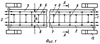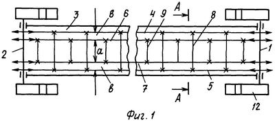 Скребковый конвейер действует следующим образом. При включении приводных блоков 12 и вращении концевых приводных звездочек 1 и 2 тяговое усилие передается внешним тяговым цепям 4 и 5 со скребками 8 и внутренним тяговым цепям 6 и 7 со скребками 9, которые обеспечивают перемещение транспортируемого груза по рештачному ставу 3. При этом все цепи 4, 5, 6, 7 работают в режиме нагружения статически определенной системы, т.е. все цепи нагружены практически одинаково. Благодаря этому тяговое усилие, которое может передать тяговый орган, значительно увеличивается, а следовательно, может быть соответственно увеличена и длина става скребкового конвейера. А это позволяет, в свою очередь, отказаться от перегрузки транспортируемого груза с конвейера на конвейер. Различные расстояния b между внутренними 6, 7 и внешними 4, 5 и расстояние а между внутренними 4 и 5 цепями позволяют ограничить ширину рештачного става 12 конвейера и выполнить его более компактным.
