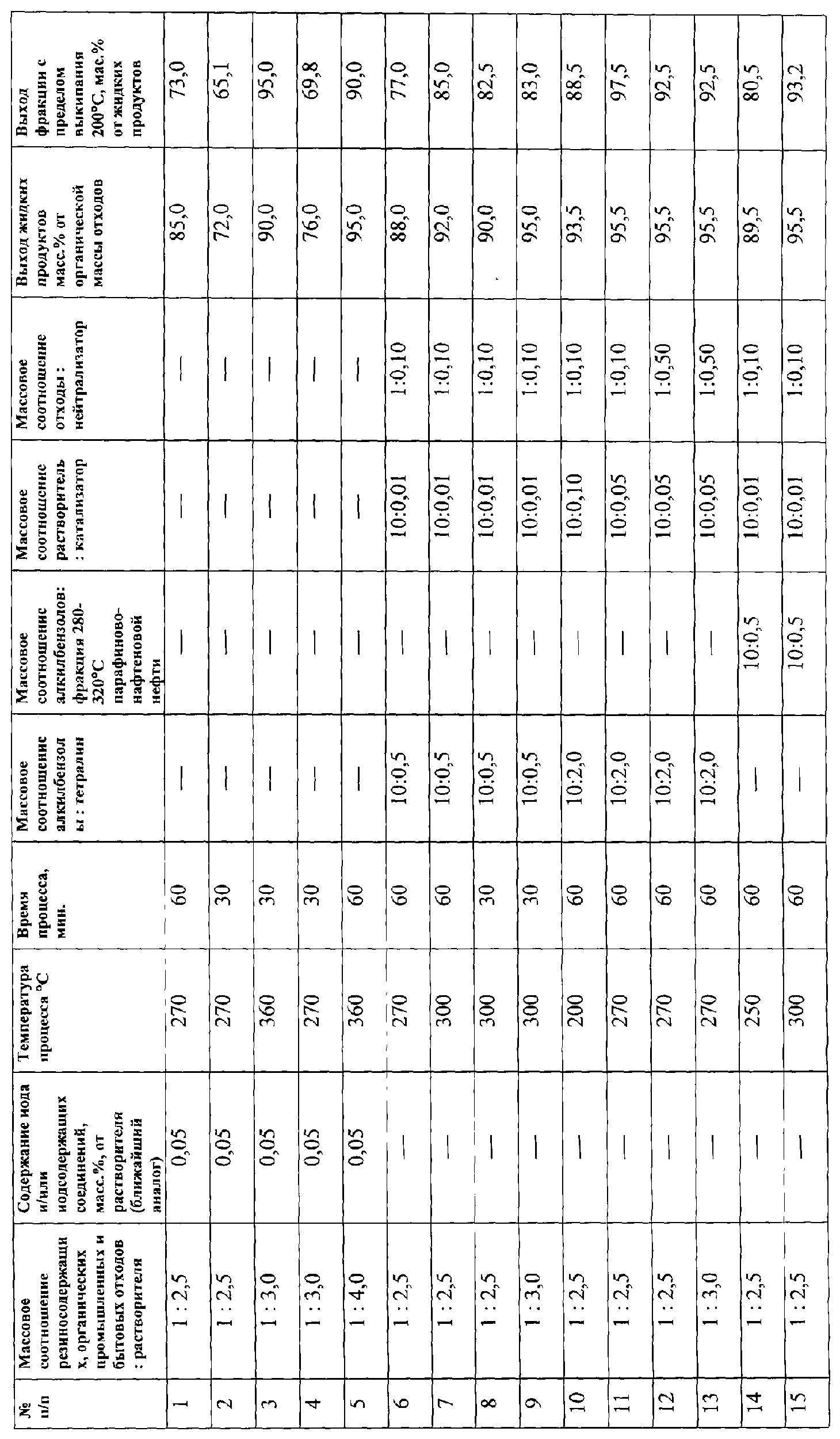 Изобретение относится к химической переработке резиносодержащих, а также промышленных и бытовых органических отходов (полиэтилен, полистирол, полиизобутилен, капрон, лавсан, энант, найлон, поливинилхлорид, различные виды каучука, фенолформальдегидные наволачные смолы и т. д.) в компоненты моторного топлива и сырье для промышленности основного органического, нефтехимического и биохимического синтеза, производству анодной массы для электротермических и электрохимической предприятий, гидро-, тепло- и звукоизоляционных материалов, асфальтобетона для дорожного строительства. Способ заключается в том, что осуществляют термокаталитическое ожижение отходов при температуре 200-320°С и давлении 1-3 МПа. При этом процесс проводят в присутствии смеси водорододонорных углеводородов, в качестве одного из которых используют алкилбензолы, а в качестве второго – водорододонорный углеводород, имеющий меньшее время индукционного эффекта. Процесс проводят в присутствии катализатора, в качестве которого используют фталоцианины или диметилглиоксиматы, выбранные из группы, содержащей медь, никель, кобальт, молибден, титан, марганец, железо и их смеси а также в присутствии добавок – нейтрализаторов, взятых в количестве 0,10-0,50 мас.% от отходов. Предпочтительно осуществление способа проводить в смеси алкилбензолов и тетралина, взятых в массовом соотношении 10:0,5-10:2,0 или в смеси алкилбензолов и фракции с пределом выкипания 230-280°С парафиново-нафтеновой нефти, взятых в том же массовом соотношении. При использовании в качестве катализатора фталоцианинов или диметилглиоксиматов, целесообразно использовать массовое соотношение растворитель : катализатор, равном 1:0,01-1:0,05. Предпочтительно процесс проводить при массовом соотношении отходы : растворитель, равном 1:2-4. Технический результат от использования изобретения заключается в повышении водорододонорного потенциала растворителя за счет более эффективного использования водорода последнего, а также селективности процесса при ожижении сложных по химическому составу отходов, упрощении технологии, обеспечении независимости от химического состава сырья, снижении температуры и давления, увеличении производительности процесса при одновременном повышении взрыво- и пожаробезопасности, экологической чистоты, увеличении выхода фракций с температурой кипения до 200°С, характеризующихся низким содержанием кислород-, азот- и сероорганических, а также непредельных соединений, повышении качества технического углерода, наполнителя в резиносодержащих отходах, пирогаза. В предпочтительном варианте осуществления способа в качестве добавок-нейтрализаторов, снижающих ограничение по химическому составу перерабатываемого сырья, используют оксиды и гидроксиды элементов I-II групп периодической системы. В предпочтительном варианте осуществления способ проводят при массовом соотношении отходы : добавка-нейтрализатор, равном 1:0.1-1:0.5. 7 з.п.ф-лы, 1 табл.