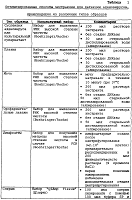 Согласно особенно предпочтительному аспекту предлагаемого в изобретении метода, вышеуказанные два положительных контроля экстрагируют параллельно с серией анализируемых образцов и они состоят из стандарта, образованного очищенным и титрованным раствором аденовируса, и калибровочного маркера, адаптированного к типу анализируемого образца.