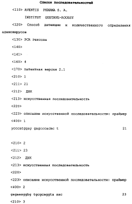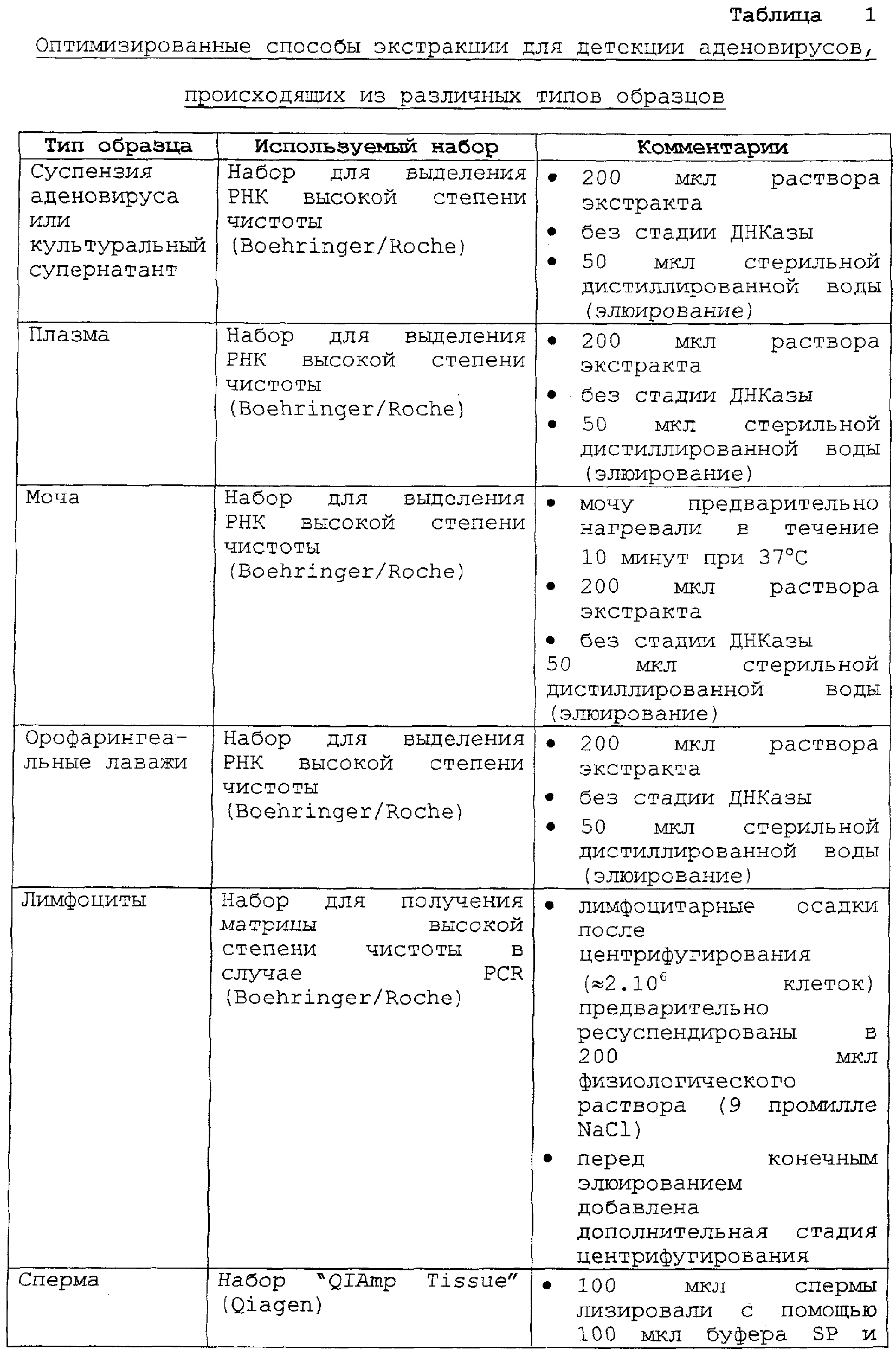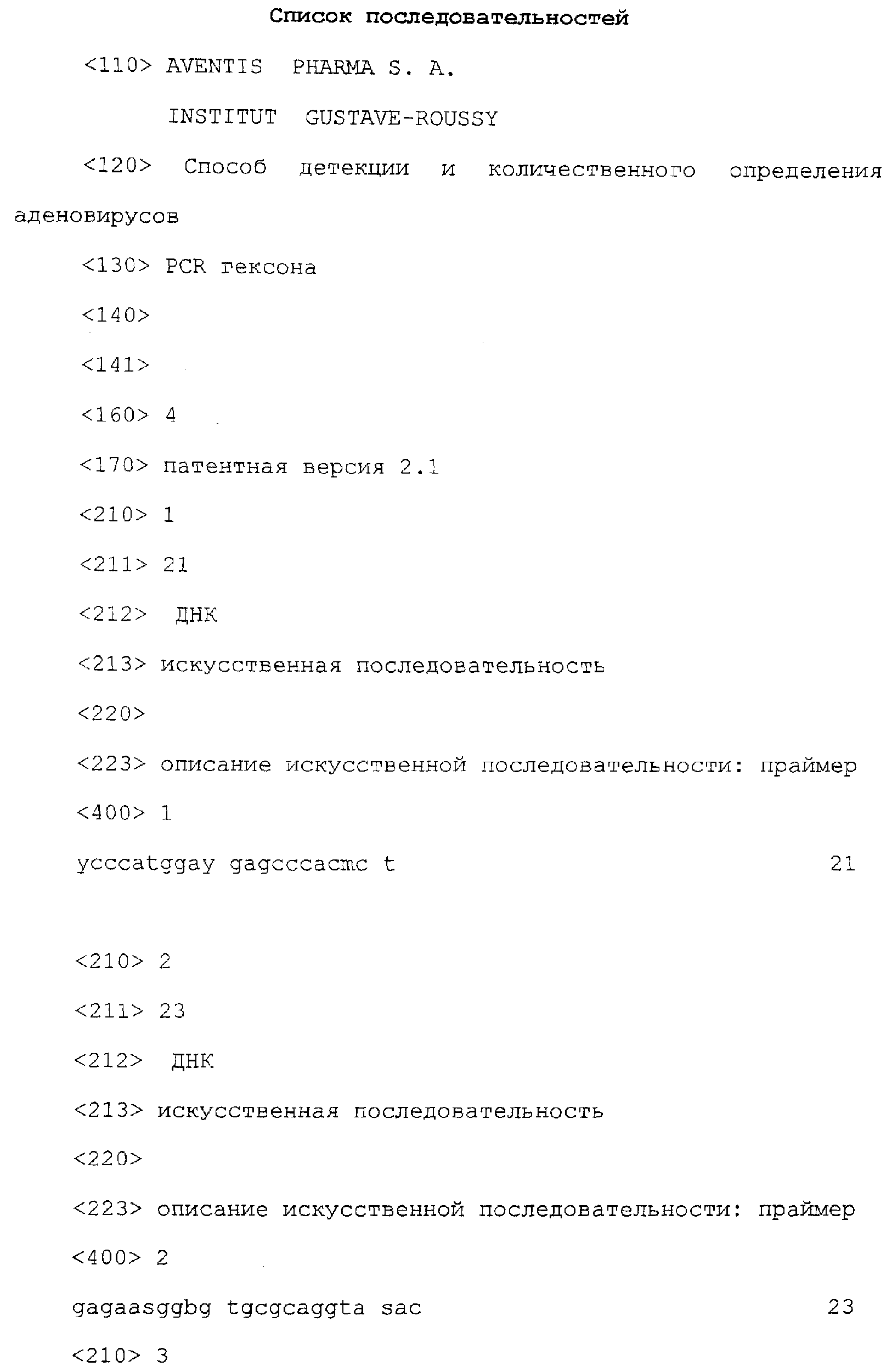 Методы амплификации выделенных из аденовирусов нуклеиновых кислот путем PCR, кроме того, уже описаны. Так, в заявке на патент Японии JP 07327700 описывается метод типа PCR, согласно которому амплифицируют части ДНК, кодирующей гексон, аденовирусный капсидный белок. Продукты амплификации подвергают дот-блоттингу, затем гибридизируют со специфическими для каждых серотипов зондами. Этот метод, следовательно, предназначен для идентификации подгрупп и серотипов, но не для детекции и количественного определения совокупности аденовирусов, присутствующих в образце. Кроме того, чувствительность этого метода является незначительной и, следовательно, он мало приспособлен для точных количественных определений, например, требуемых во время наблюдения пациентов, к которым применялась генная терапия.