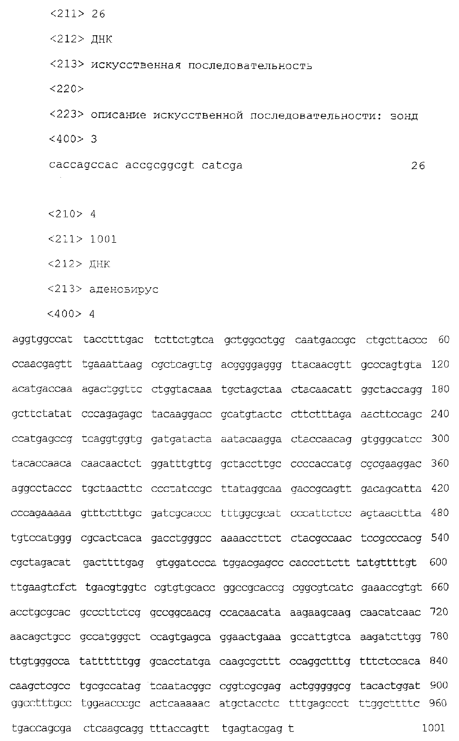 Последовательности праймеров и/или зонда преимущественно обладают гомологией по меньшей мере на 80% с последовательностью от нуклеотида 540 до нуклеотида 780 идентифицированной последовательности №4 или с комплементарной к ней последовательностью. Оба праймера выбирают, соответственно, из смысловой и антисмысловой нитей таким образом, чтобы можно было осуществлять амплификацию фрагмента ДНК. Что касается зонда, то его выбирают так, чтобы он гибридизировался с полученным в результате реакции амплификации фрагментом ДНК. Праймеры PCR согласно настоящему изобретению, используемые для амплификации аденовирусной нуклеиновой кислоты-мишени из образца, находятся в постоянной области гена гексона человеческих аденовирусов, а сайт гибридизации зонда согласно настоящему изобретению находится между обоими праймерами. Аденовирусы предпочтительно имеют человеческий тропизм.