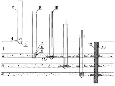 Новизна заявляемого способа обусловлена тем, что решена проблема закрепления нескольких пропластков слабых грунтов в процессе подготовки скважин для устройства набивной сваи, боковая поверхность которой будет взаимодействовать с укрепленными участками.