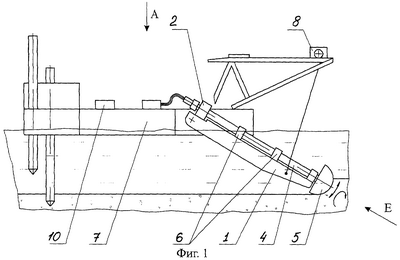 Базовое судно 7 оснащено механизмами 9 горизонтального (вправо и влево) перемещения рабочего органа (совместно с судном), например лебедками с гидравлическим приводом с насосной станцией 10 привода горизонтального перемещения (НСГП). На нем размещен источник 11 воды высокого давления (ИВД), а также станция 12 управления (СУ) механизмом управления распределительным устройством.