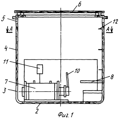 На фиг.1 представлена схема контейнера в вертикальном сечении, на фиг.2 – поперечный горизонтальный разрез по А-А.