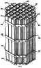 Другой известный из ЕР-А-0752151 способ состоит в изготовлении корзины, образованной из отделений с правильным многоугольным поперечным сечением с помощью сборки пучка идентичных прямых металлических труб, каждая из которых имеет указанное поперечное сечение. Трубы могут быть изготовлены из одного куска материала требуемой формы и размеров. При этом достигается умеренная стоимость изготовления за счет использования обычной технологии экструдирования. Длина труб предпочтительно выбирается равной высоте корзины, что способствует упрощению процесса сборки и снижению стоимости. Компактность и сцепление пучка труб обеспечивается с помощью окружающих пучок и распределенных по всей высоте пучка монтажных средств, таких как охватывающие структуры.