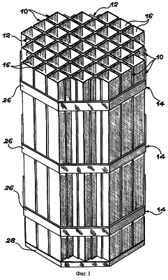 Ядерная критичность контролируется также частично за счет добавления в структуру корзины поглотителей нейтронов, таких как бор или кадмий. Эти поглотители могут быть включены в дисперсной форме в металл труб 10 или в металл крестовин 12, или одновременно в оба этих компонента. В качестве альтернативного решения поглотитель может быть нанесен также в виде слоя материала, такого как спеченный материал на основе карбида бора, на фланцы 18 крестовин 12.