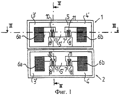Со ссылками на фиг.1-4 описан вариант выполнения электрической машины с первым узлом 1 машины и вторым узлом 2 машины. Узлы 1 и 2 устройства имеют по существу идентичную конструкцию и, таким образом, будет подробно описан только первый узел 1 машины.