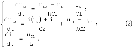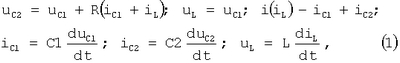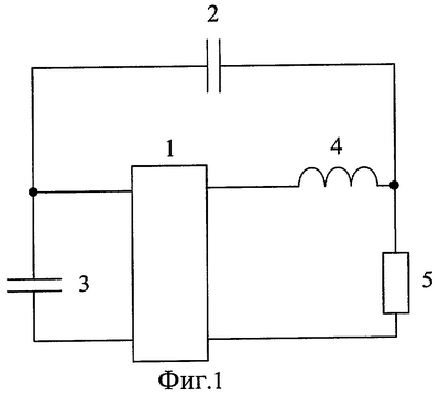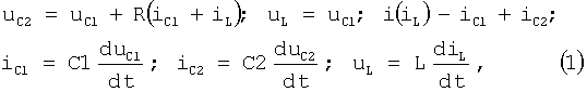 где С1 и С2 – емкости конденсаторов 2 и 3; L – индуктивность индуктивного элемента 4; R – сопротивление резистора 5; uC1 и uC2 – переменные напряжения на конденсаторах 2 и 3, соответственно; iC1 и iC2 – переменные токи, протекающие в конденсаторах 2 и 3, соответственно; uL и iL – переменное напряжение на индуктивном элементе 4 и протекающий через него переменный ток, соответственно.