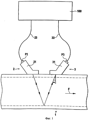Каждый из ультразвуковых преобразователей 2, 3 состоит из пьезоэлемента Р2, Р3 и элемента 21, 31 связи, который вводит ультразвуковые сигналы под отличным от 90° углом либо в стенку трубопровода, либо выводит из нее. Угол выбирают так, чтобы в среде образовался как можно более плоский угол и чтобы в то же время был возможен ввод ультразвука в как можно большее число материалов труб без полного отражения.