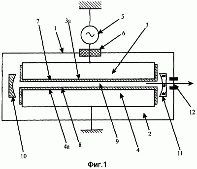 Показанный на фиг.1 газовый лазер щелевого типа содержит герметичную камеру 1, заполненную активной газовой средой 2, например газовой смесью на основе СО2. Внутри камеры 1 установлена пара протяженных металлических электродов 3 и 4, например из алюминия, соединенных с источником переменного напряжения 5, расположенным вне камеры 1. В примере выполнения лазера, показанном на фиг.1, электрод 3 соединен с источником 5 через герметичный изолирующий ввод 6, в то время как электрод 4 заземлен. Электроды 3 и 4 имеют соответствующие поверхности 3а и 4а, обращенные друг к другу. Электроды 3 и 4 предпочтительно снабжены системой принудительного охлаждения (не показана).