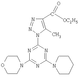 Пример 2. 2-Морфолил-6-пиперидил-4-[(4′-этоксикарбонил-5′-метил-1′,2′,3′-триазол)-1′-ил]-1,3,5-триазин (МПЭТ). В условиях, аналогичных примеру 1, из 2,92 г (0,01 моль) 2-азидо-4-морфолил-6-пиперидил-1,3,5-триазина, 2,6 г (0,02 моль) ацетоуксусного эфира и 2,02 г (0,02 моль) сухого и свежеперегнанного триэтиламина, с той лишь разницей, что прибавление ацетоускусного эфира и триэтиламина осуществляют при 25±1°С, а перемешивание смеси продолжают 35 ч при 40-45С, получают 2,47 г (85,0%) МПЭТ в виде белого цвета порошка с т.пл. 198-199°С, не растворимого в воде, но растворимого в полярных органических растворителях.